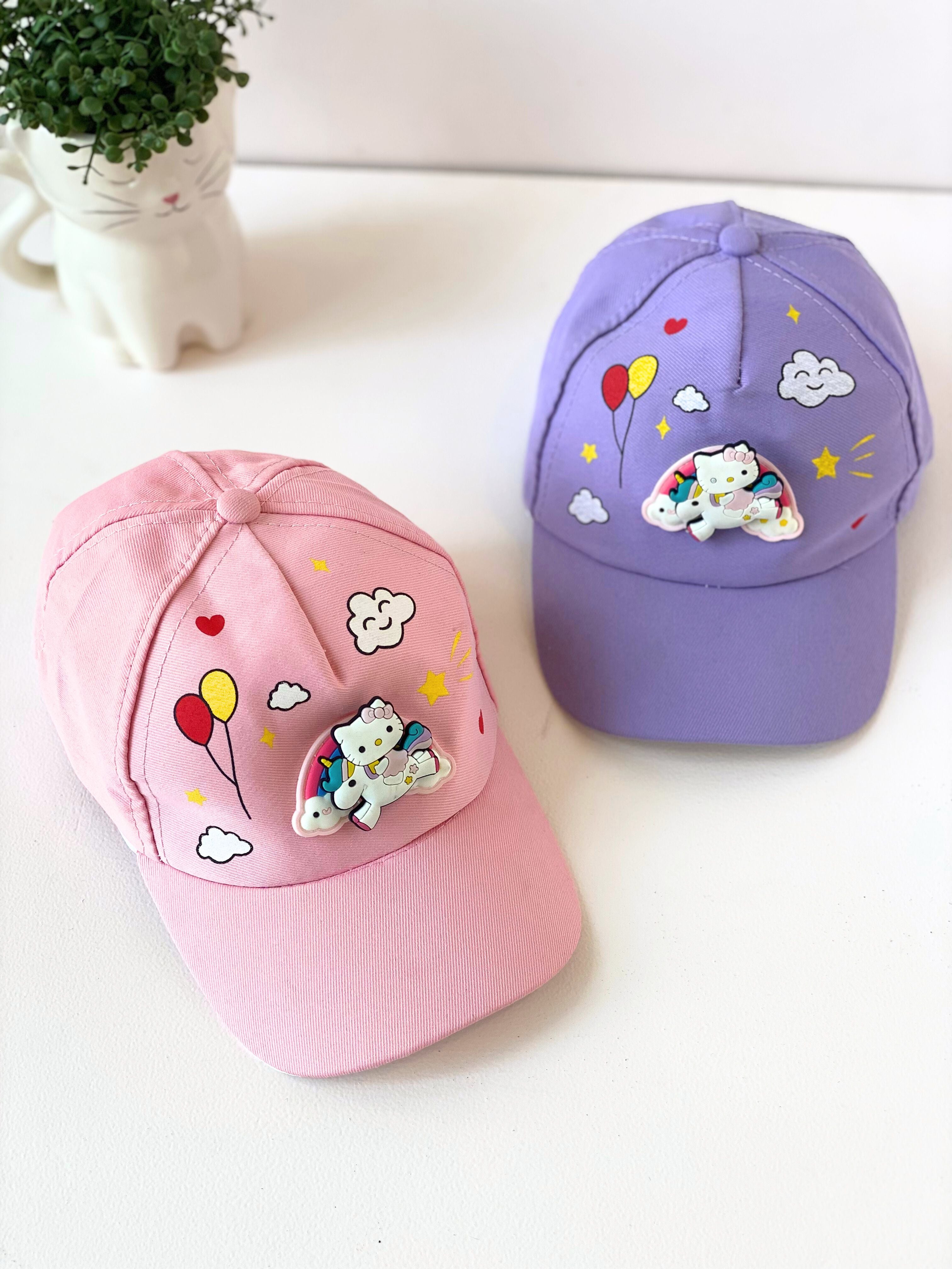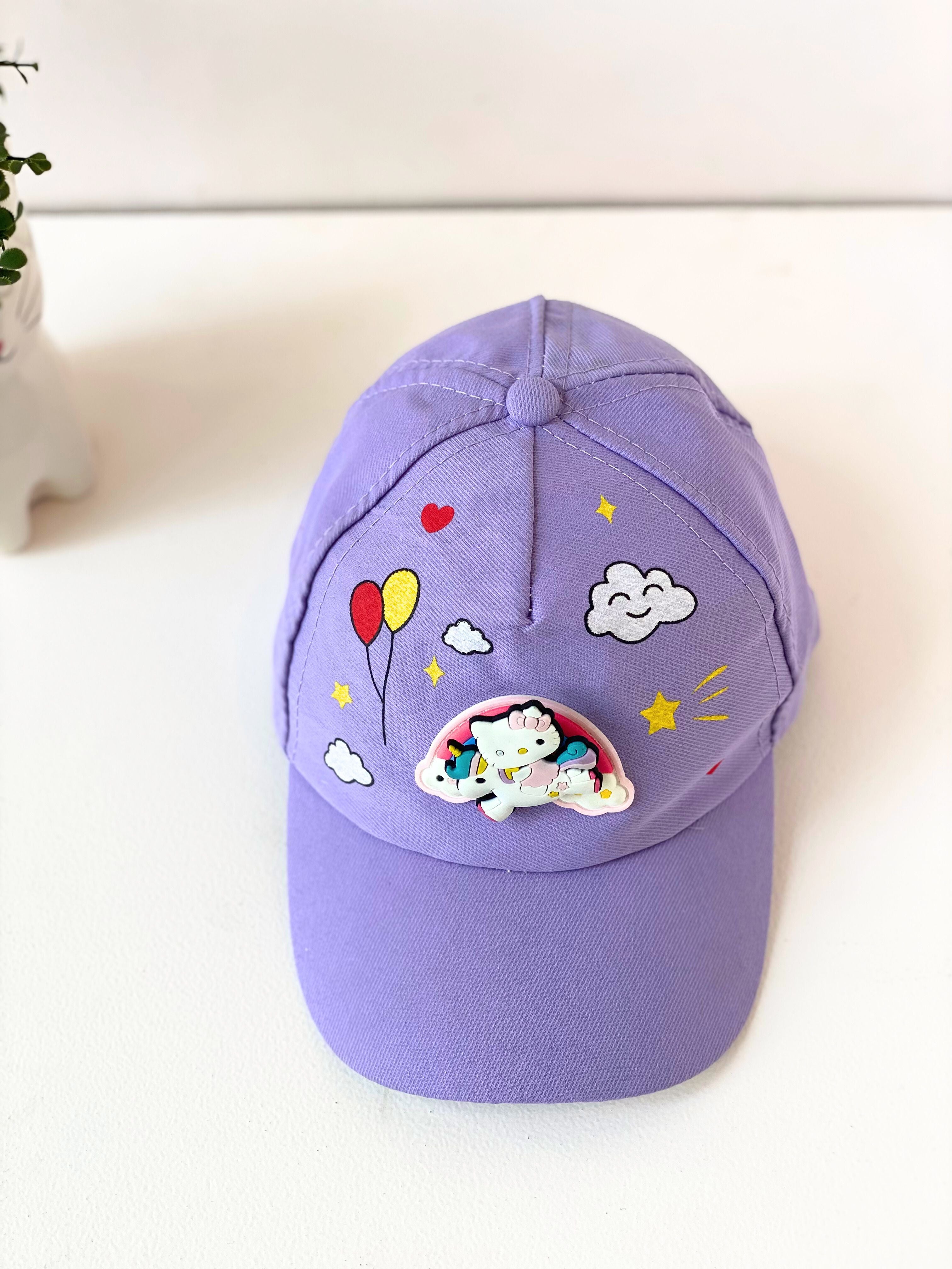 Adorable Cartoon Unicorn Kids Cap – Pink or Purple | Cute Balloon & Cloud Design