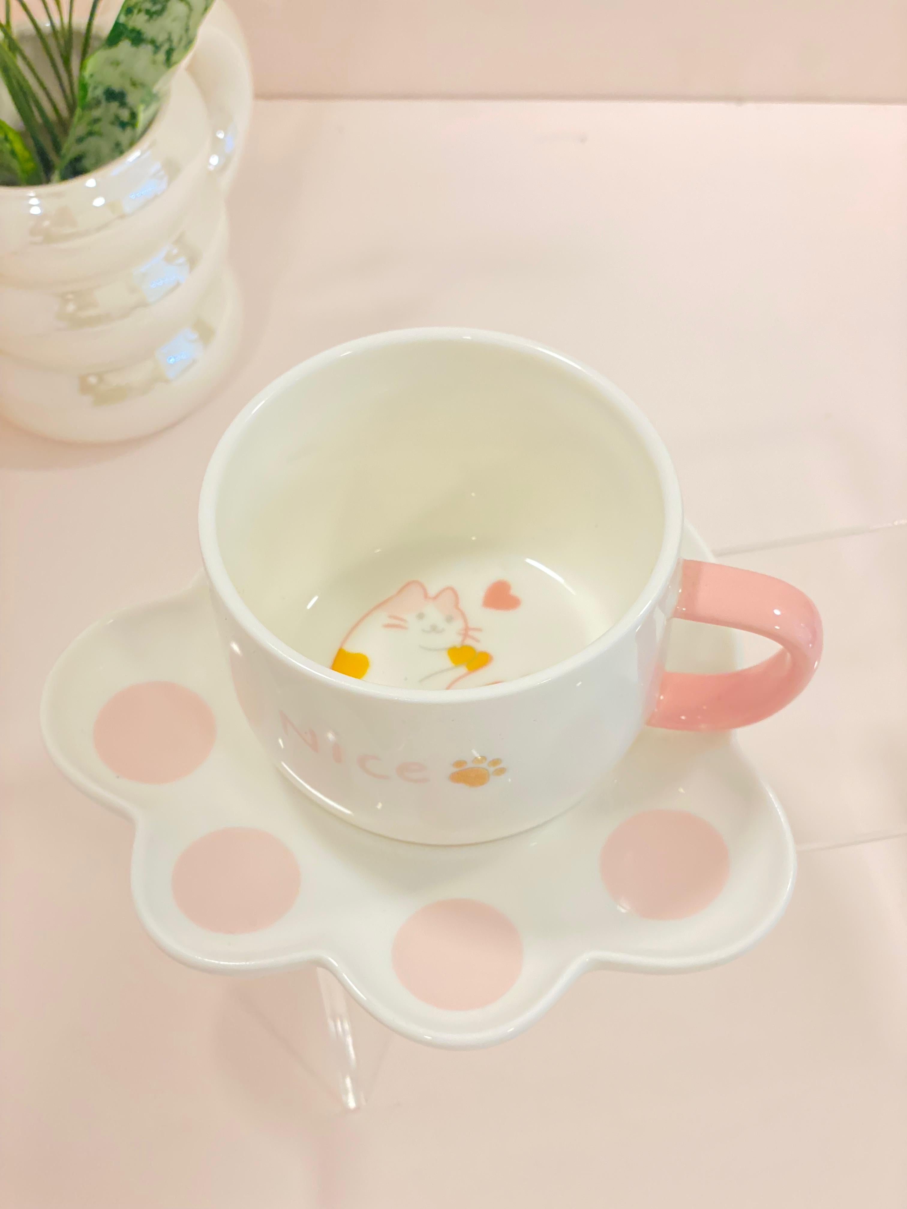 Make your tea or coffee time extra adorable with this cute cat paw ceramic cup and saucer set. Designed for lovers of pastel aesthetics and kawaii décor, this charming mug features a playful cartoon illustration inside and a unique cat paw–shaped saucer that adds personality to every sip.