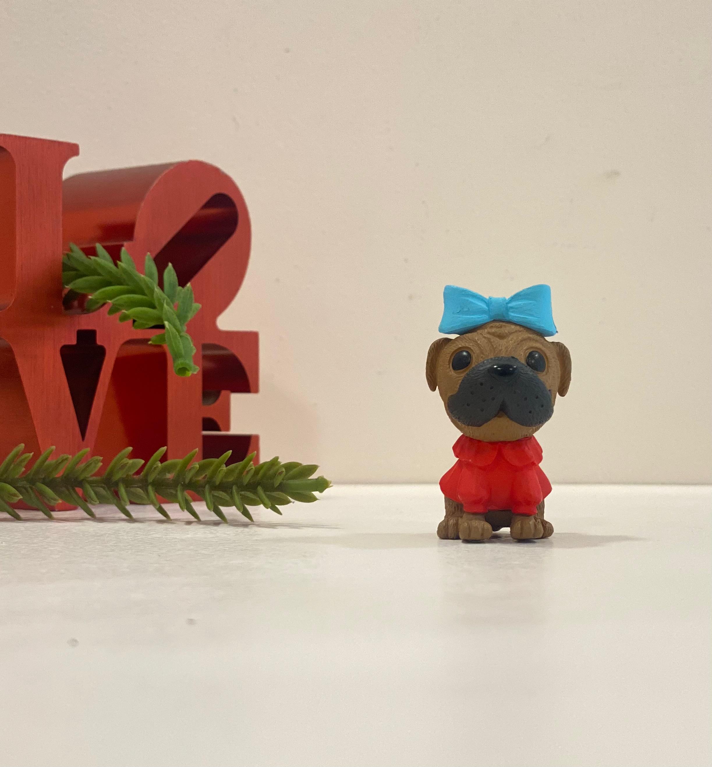 • Brown Puppy with Blue Bow & Red Dress