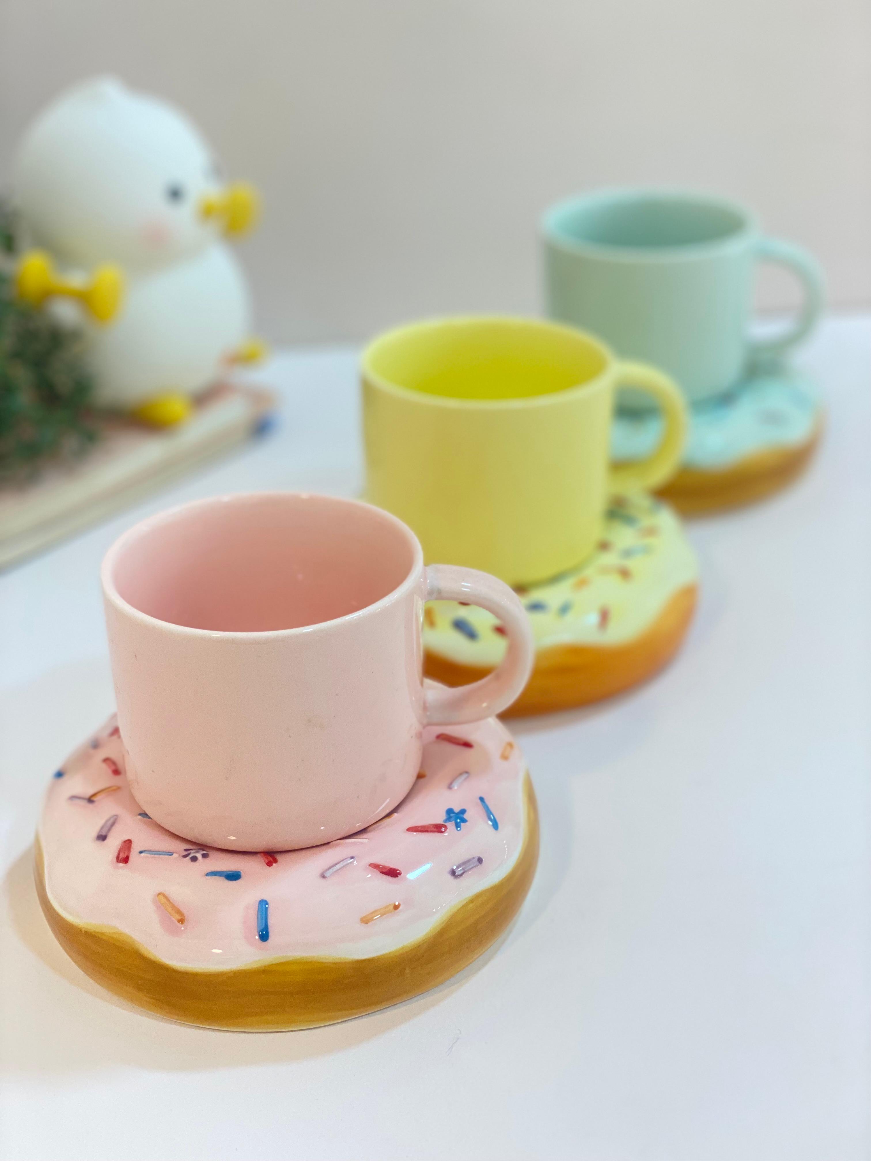 Donut Coaster Coffee Mug Set – Pastel Ceramic Cup with Sprinkle Donut Base
